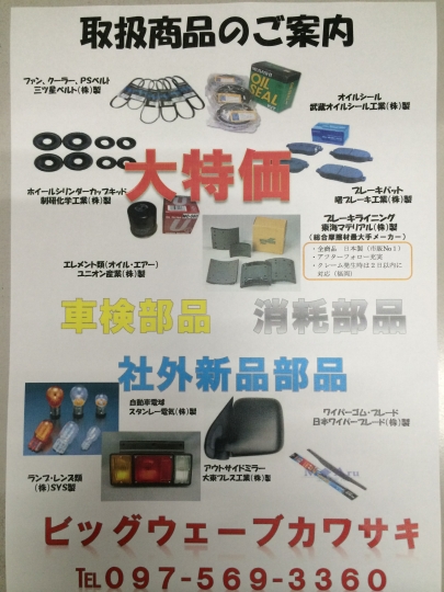 各種車検部品、消耗部品、社外新品部品を大特価にて販売致します。